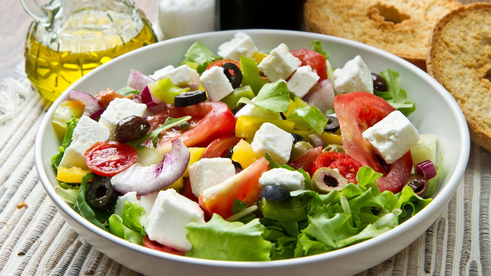 - Dans un saladier, mélangez la laitue, les tomates, le concombre et les poivrons.