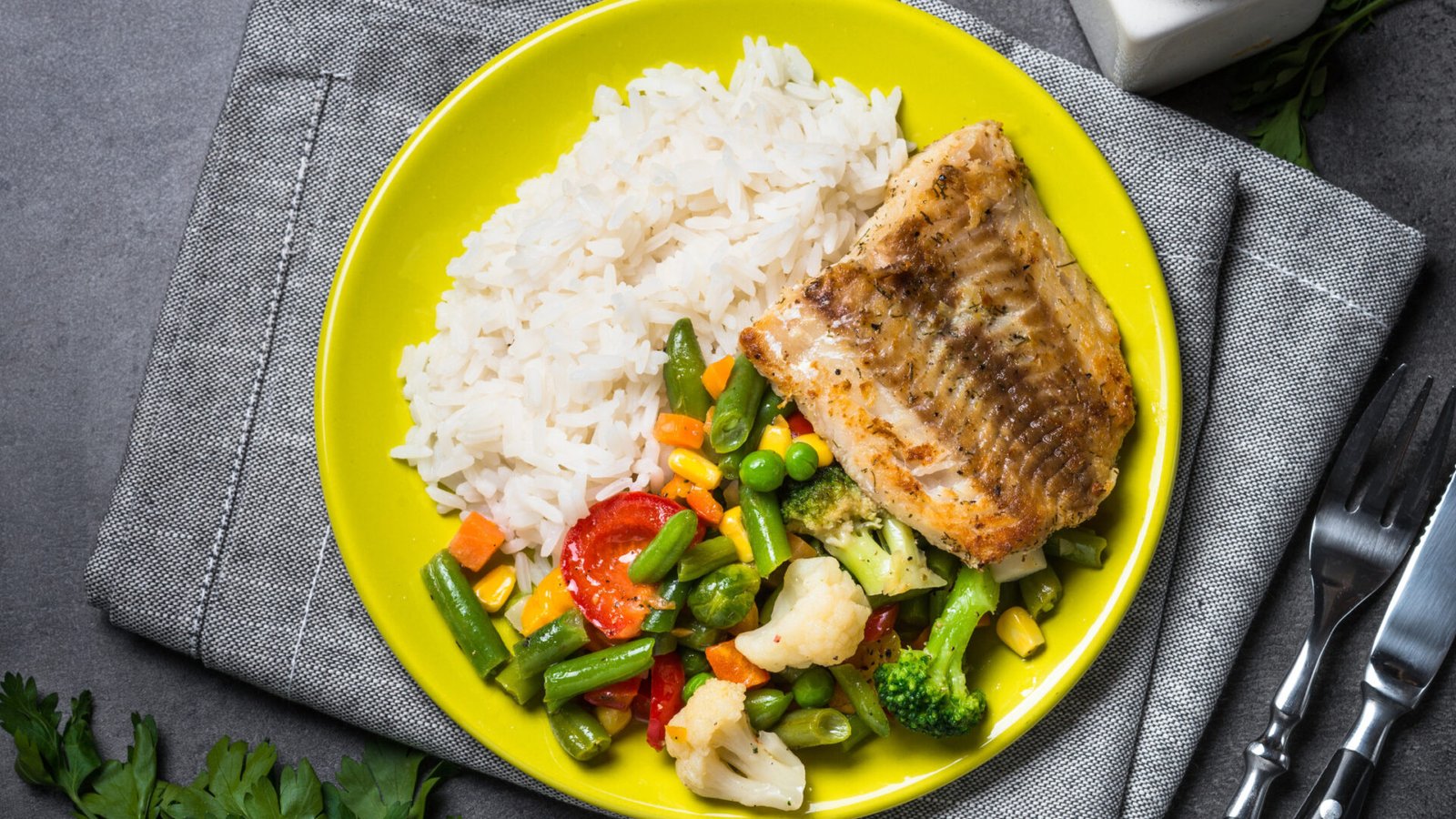 Portion de poisson grillé accompagné de riz et de légumes vapeurs