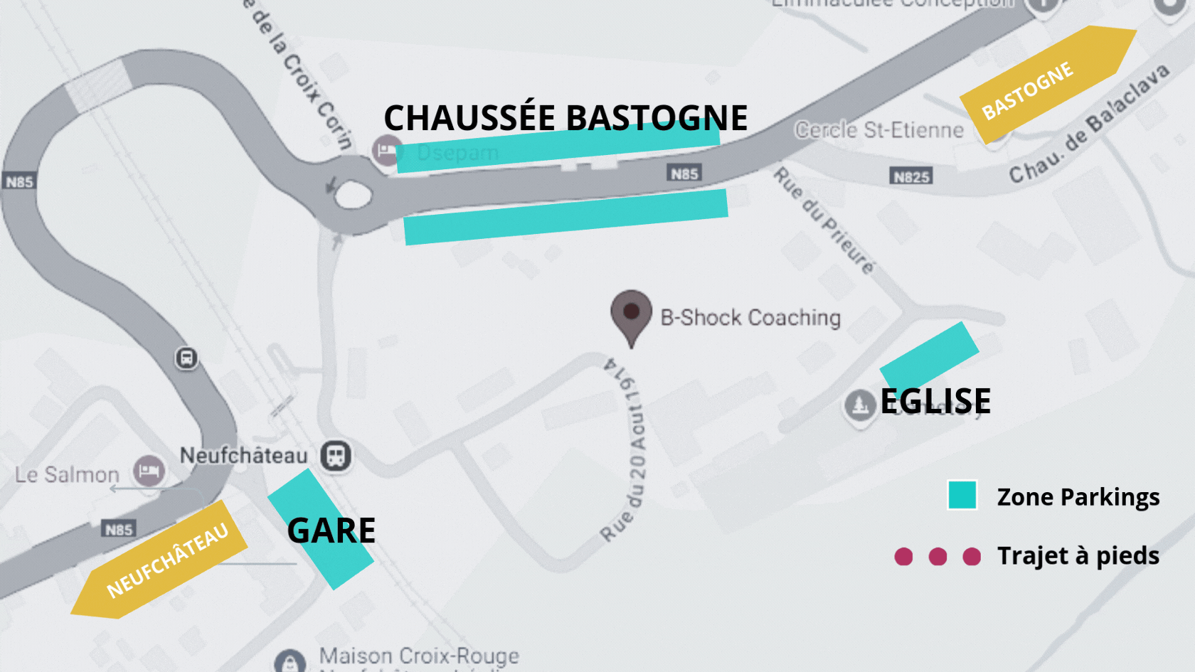 Nous vous demandons donc de vous garer sur le parking de la GARE ou sur la CHAUSSÉE DE BASTOGNE (proche du rond points près des rails de chemin de fer) ou au parking de  L’ÉGLISE (Rue du Prieuré).